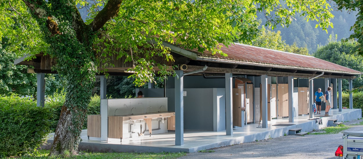 Bloc sanitaire avec douches chaudes, lavabos, espaces vaisselle et un espace adapté aux personnes à mobilité réduite.